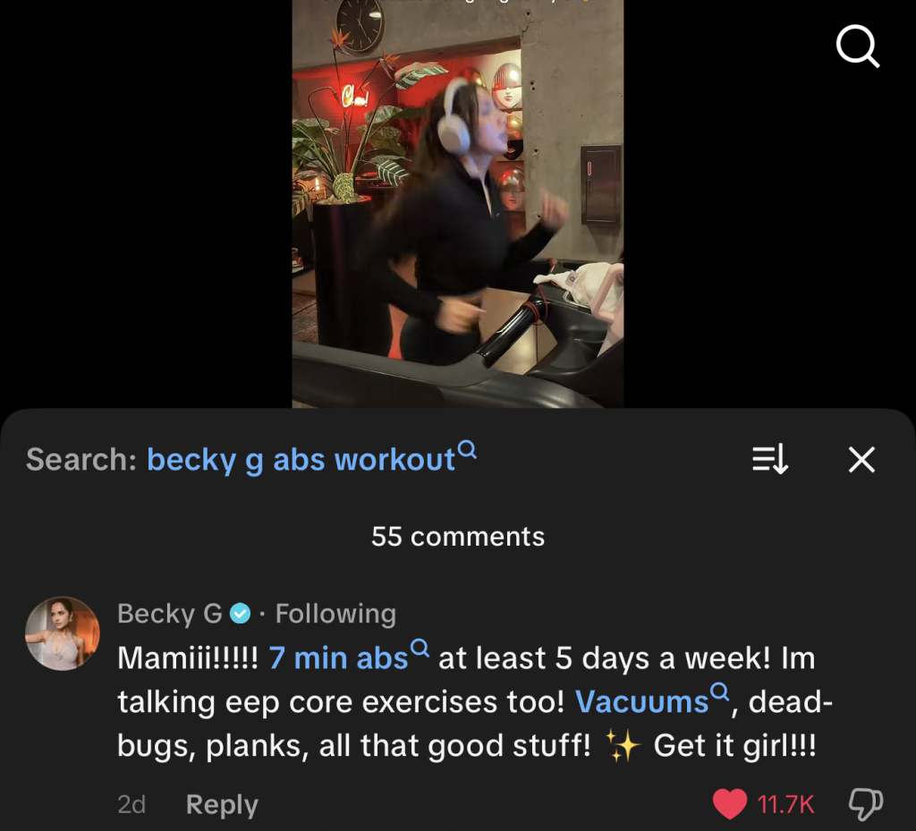 In March, user Alegria Jimenez posted a Tiktok of her running on the treadmill adding text that read, “No bc I WILL be sprinting for my life until these abs start giving Becky G 😭.”